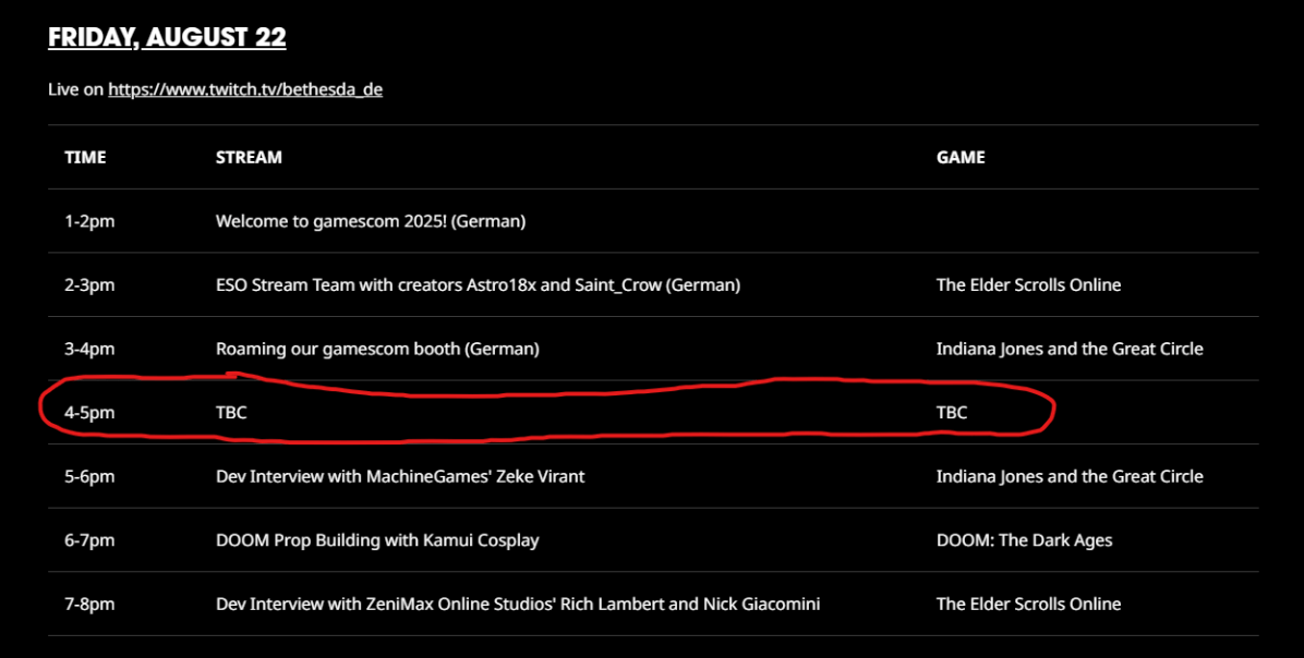 On Friday, August 22, Betheda’s schedule lists one thing occurring at 4-5pm, however whereas each different slot has a sport listed reminiscent of Indiana Jones & The Nice Circle, the 4-5pm slot merely says “TBC”.